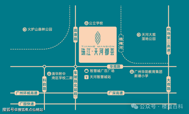 休闲——紧邻广州第一个海绵城市湿地公园—大观湿地公园,火炉山森林公园、天河智慧农业公园、旧羊山公园等公园环绕,还紧邻杨梅河,规划将打造品质智慧的都市碧道与滨河景观带;