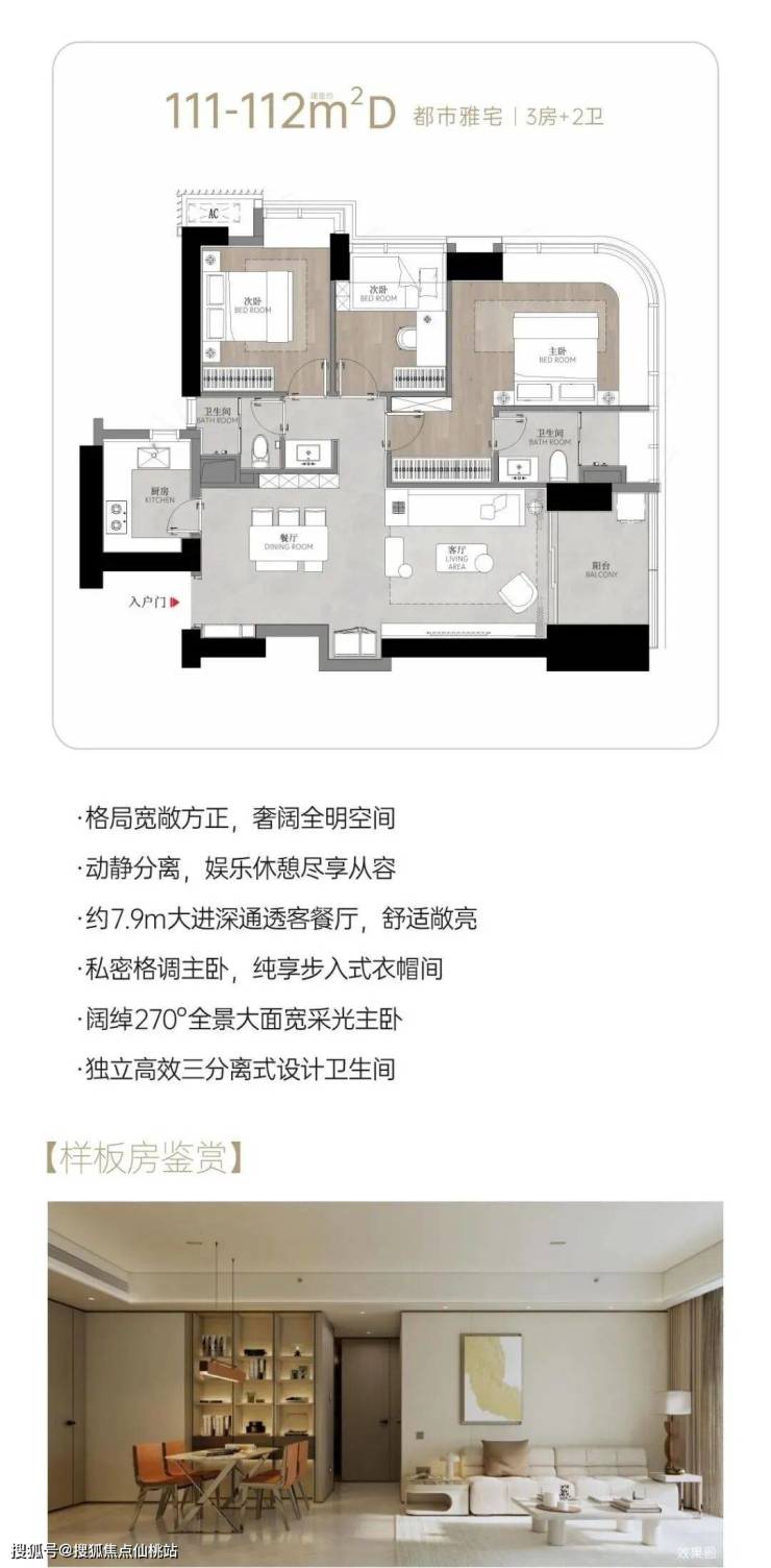 111-112㎡的3房2厅2卫,设计的是竖厅格局,客厅3.45米开间,LDKB一体化,S墙设计预留冰箱卡槽位,三开间朝南,动静分区,主卧270°全景大面宽采光主卧,分别做到了主卧13.1m²/次卧9.73m²/次卧7.02m²(实测面积,去掉墙体),U型厨房,公卫三段式干湿分离,得房率约71.7%(不含赠送),套内面积79.99m²,东南朝向。
