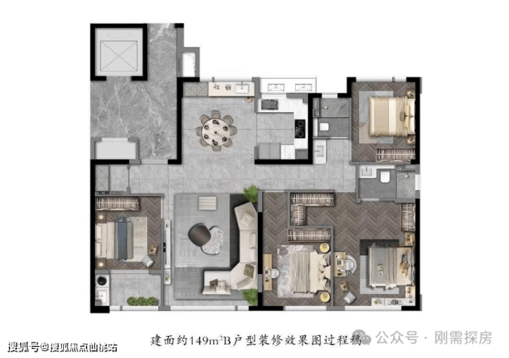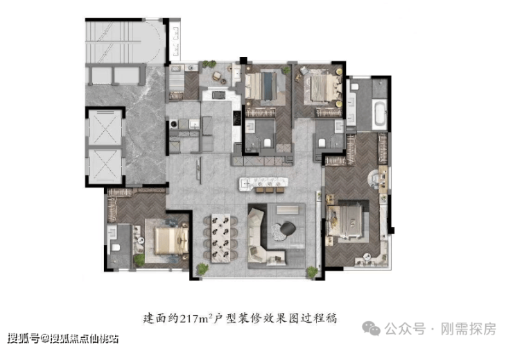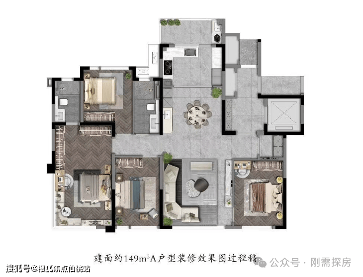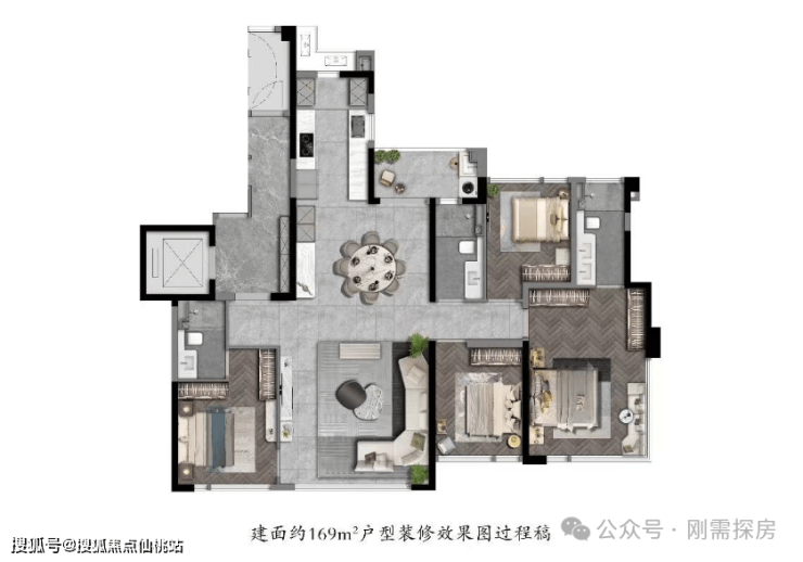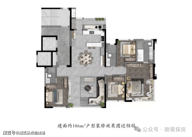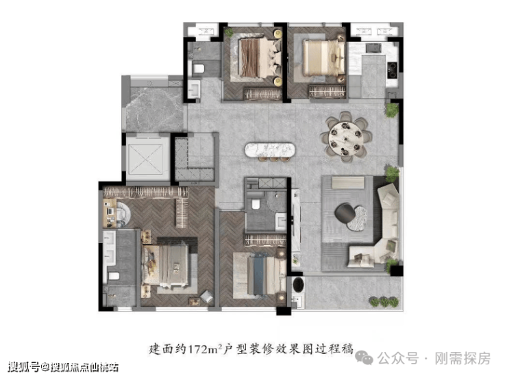 172平米:四房两厅三卫,独梯设计,位于5#小高层,采取L型观景布局,这几年出现在部分改善盘的180-210平的产品,产品特色就是动区空间大,4个卧室除了主卧空间都一般,其中一个还是暗卫。