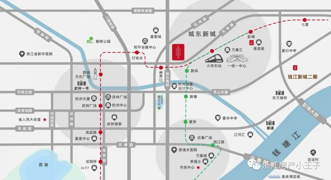 【交通配套】:地铁1号线闸弄口站,4号线新风站直线约600米、火车东站站约600米、秋石高架 德胜快速路 上塘高架、10分钟到达西湖,市中心 无缝对接钱江新城,武林商圈【商业配套】:距在建中的一街一中心约1KM、距嘉里城项目约2KM、衣之家百货、天城衣之家、万象汇,港龙城,和平会展中心【医疗配套】:周边聚集全浙江较好的医疗资源,浙一、浙二、邵逸夫,还有红会医院,都在项目周边3公里范围内。