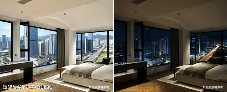 住在这样的主卧里,可以同频城市的气息,感受城市的脉搏,大有居高临下的阔达感。钟情于城市美学的朋友们,这流动的光影诗篇,有没有正合你心?