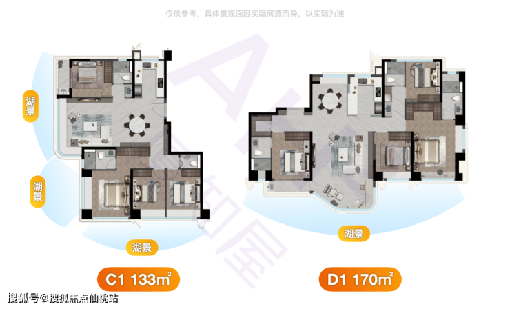 133㎡的C1户型,岛内最稀缺,最小双面瞰湖神户型,客厅、卧室、主卧,都有景观!主卧“两面”湖景,躺在床上,就可以看湖,这体验简直美滋滋;