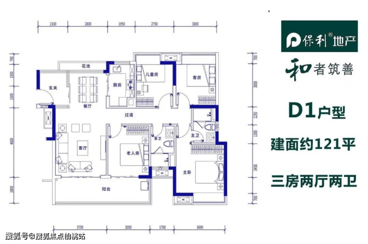 D1户型 三房两厅两卫 建筑面积为121㎡