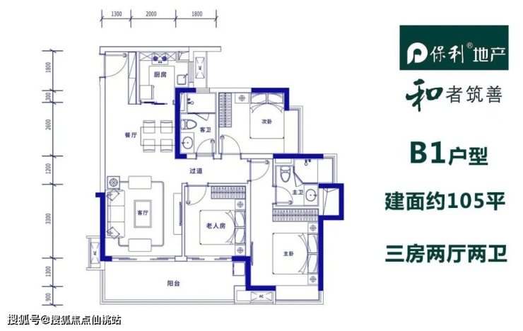 B1户型 三房两厅两卫 建筑面积为105㎡