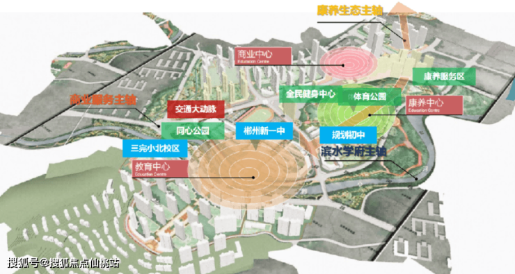 以全民健身中心为辐射点,配建体育公园、同心公园,康养中心为保障,休闲景观、风光带为桥梁,打造郴州覆盖全龄段康养生态活力城。