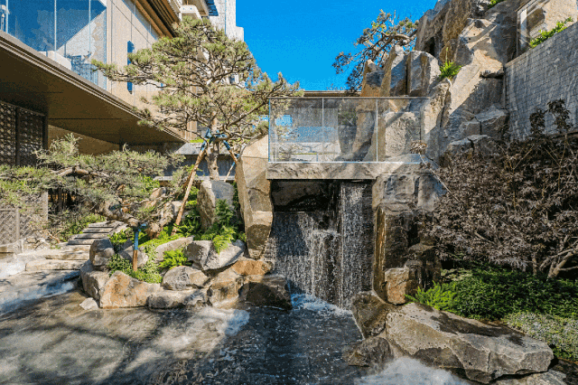 层叠交错的山石,模拟峰峦起伏,瀑布从假山飞泻而下,象征着生生不息的财运与活力,四周种着苍劲葱郁的松林,传递“坚韧不拔” 的精神内核。