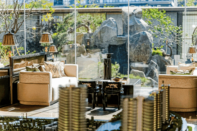 穿过大门,便抵达以岭南名园“余荫山房”为灵感打造的“余荫山堂”会所大堂。这里空间高挑,光线透过精致的格栅与窗棂洒落,营造出静谧而富有文化韵味的过渡空间。而真正的惊喜,在于步出会所后豁然开朗的“中天云庭”。