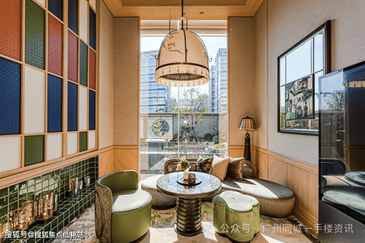 接待大厅的梁柱设计,由传统镬耳屋拱券演变而来;水吧区背景墙,采用岭南花窗框架;会客区的茶桌也是一处空间亮点,把园林古建筑的螺钿工艺融入现代家居。