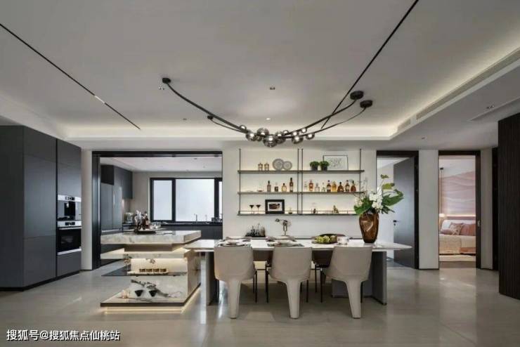上午,在空间的折叠之下,烹饪、就餐、亲子、娱乐等丰富场景交融互联,家庭的交流黏合情感;午后,LDKB一体化中央方厅化身社交剧场,朋友们在此畅谈,分享生活的美好……进与退的从容也赋予了空间以独特的气质——既向内守望生活的温度,又向外连接圈层的社交。