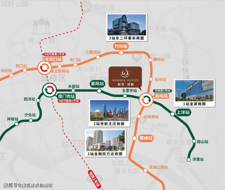 距离2/4号线交汇前屿站,直线距离只有约200米。坐2号线,4站地铁就能达到南门兜。