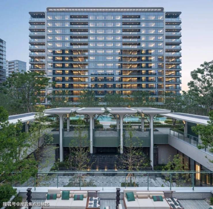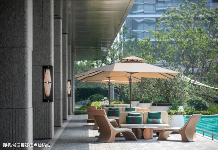▲嬉水池旁的「灰空间」和户外沙发,绿城·芝澜月华,杭州,实景图