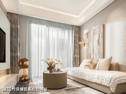 入户赠送收纳功能强大的玄关柜,厨房天花采用石膏板+回型灯设计,客餐厅天花弧形吊顶、地面采用大地砖,造价更高、更耗时耗力,也更美观。