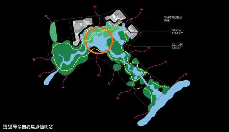 “COASIS”海岸绿洲重建公园生态,重塑公园与城市的关系。打破传统商业模式,营造立体水街商业空间,提升水街两岸商业氛围;双环动线联通,激活片区活力;建筑与环境互融,打造海岸绿洲-COASIS,引领未来商业设计潮流。