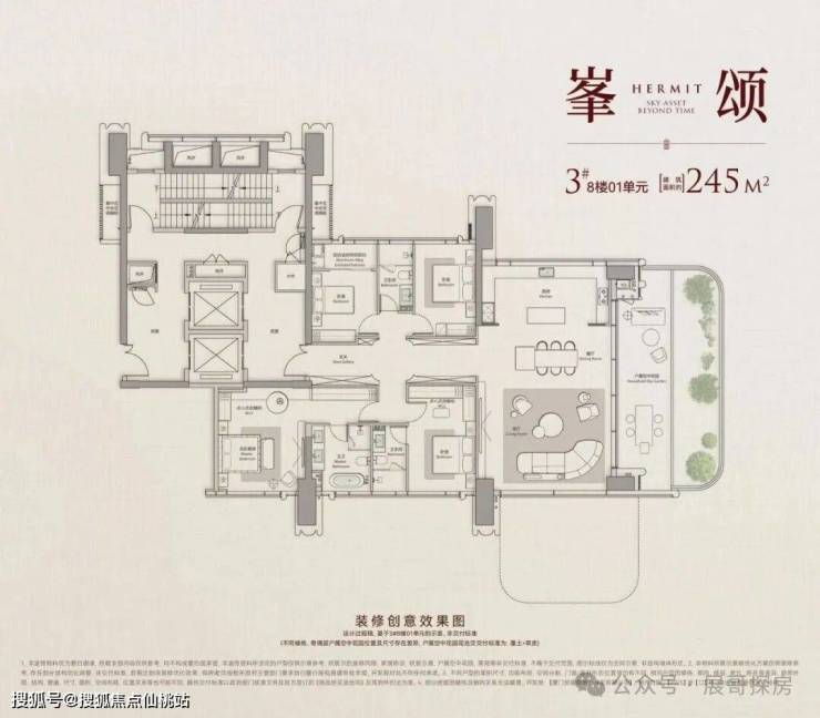 ○格局:一梯一户,私梯入户;LDKB一体化,约120㎡核心动区;270°全景空中庭院(赠送约20%套内面积),可做花园/茶室/亲子区