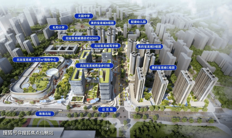 地块规划:宝龙负责商业部分(购物中心+商业街+酒店式办公写字楼),美的负责开发● 建设住宅部分(B、C、D组团)及幼儿园