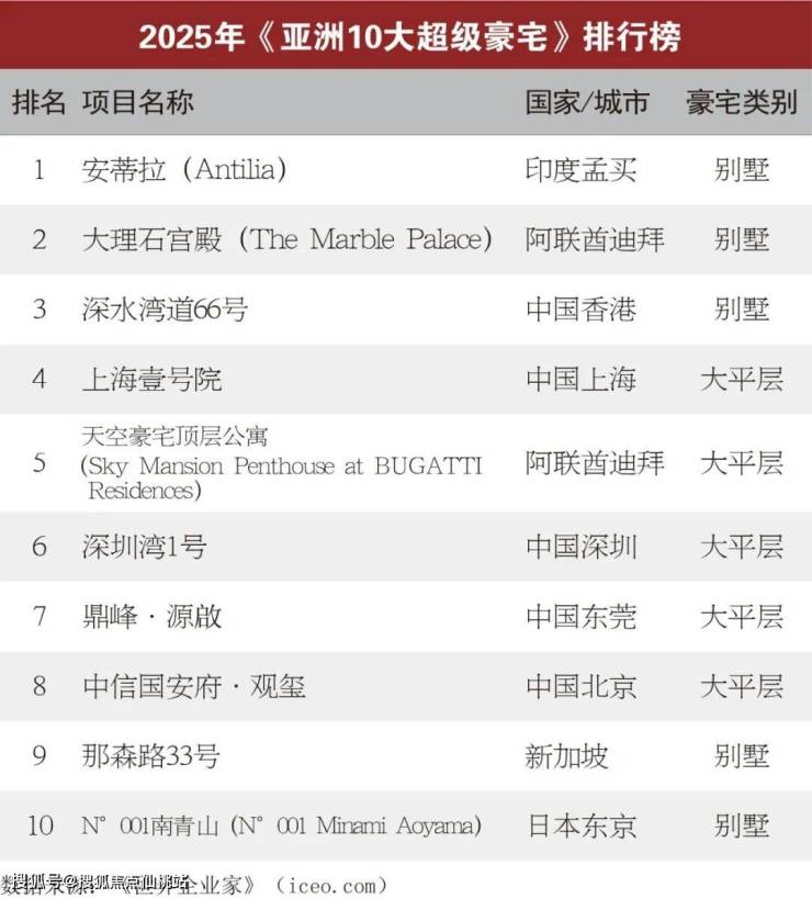 2025年(第十六届)“亚洲10大超级豪宅”排行榜于9月24日在香港揭晓。印度安蒂拉、阿联酋迪拜大理石宫殿、香港深水湾道66号位居前三。上海的上海壹号院、深圳的深圳湾1号、东莞的鼎峰•源啟和北京的中信国安府•观玺榜上有名。