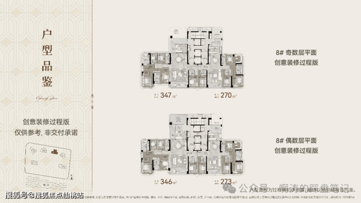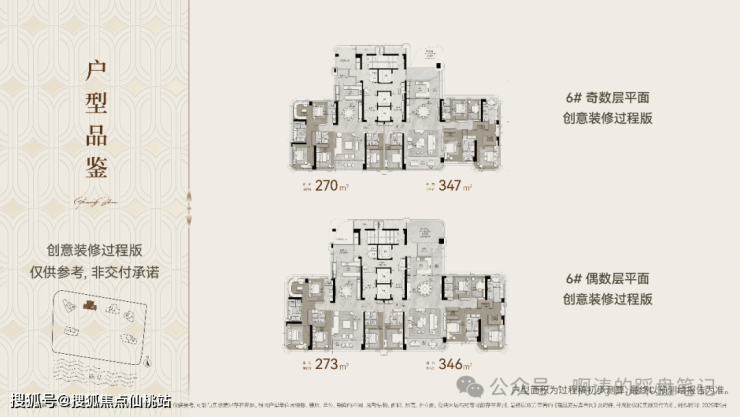 270/273㎡户型特点: 一层两户,3T2户独立梯厅互不扰; ·5.7*11.65m直厅宽敞大气; ·客厅、阳台、众数套房可正南望江及 琶洲会展; ·南北对流双阳台; ·工人梯独立动线,保障豪宅私密性; ·主卧270°景观转角飘窗; ·800mm飘窗可打; ·奇数层32㎡6.6m通高平台空间;