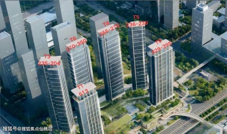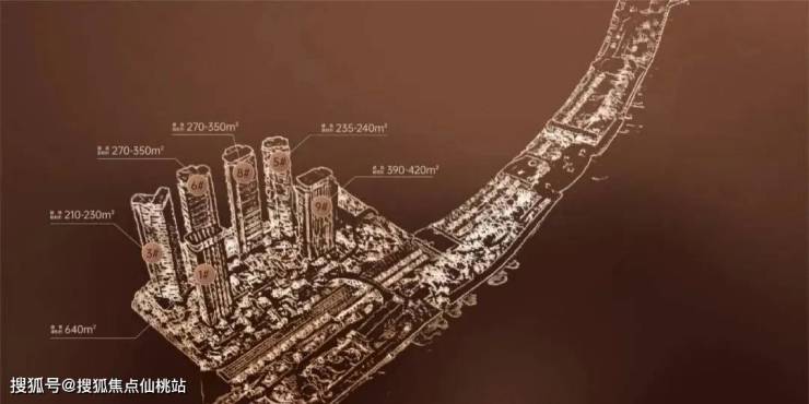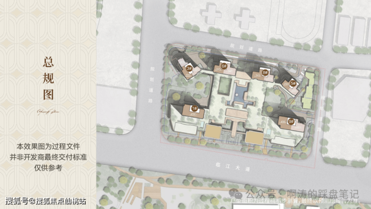 项目地势做了整体抬升,整体排布北高南低,呈半月型布局,共计6栋住宅。前低后高,前排2栋分别为35层和37层,后排4栋从东往西分别是50层、49层、49层和50层,前高后低的设计,以及后排两栋楼的扭转,也实现了100%望江,货量共约500来套。