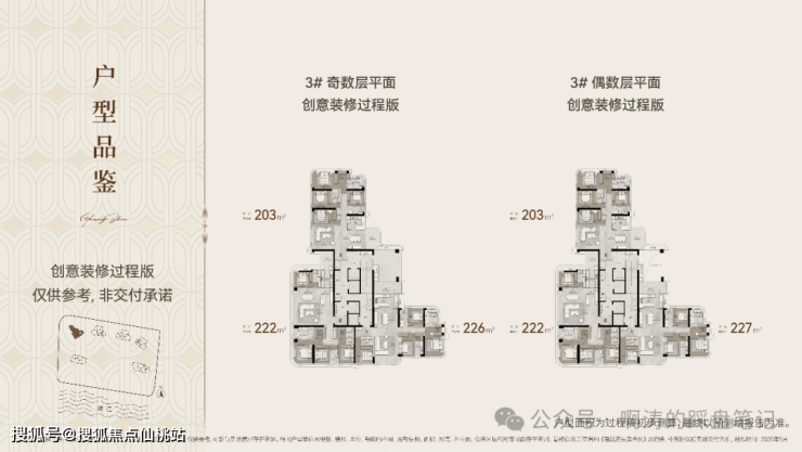 226/227㎡户型特点: 4T3户,均有独立电梯及门厅互不扰; ·8*8.4m大方厅,宽敞大气; ·超款客厅落地景观面,客厅、阳台、众数套房可望 江望琶洲总部及广州塔,景观优势(无主阳台); ·有独立工人房但无赠送平台; ·主卧270°景观转角飘窗,800mm飘窗可打;