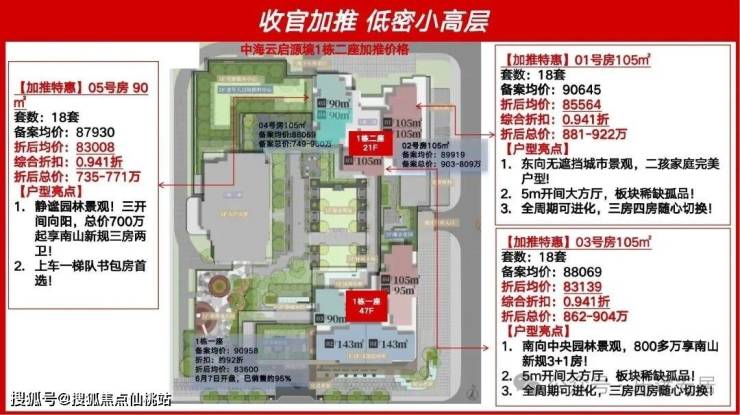 第一次首推:6月7号1栋1单元首次开盘,共207套90-143㎡3-4房,备案均价9万,开盘约0.918折优惠,折后均价8.26万,总价701-1338万。