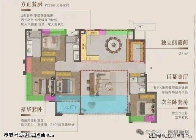 127平:4房2厅2卫,占比22.6%,116平的升级版,客餐厅面宽加大,主卧出现了目前改善常见的L型窗,进一步拉高了得房率。