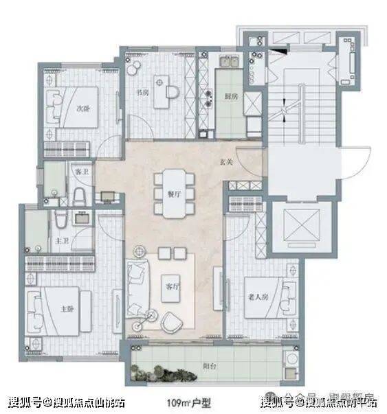 103平:4房2厅2卫,占比23%,三开间朝南,类似四叶草,优势是没有过道空间浪费,劣势在于餐厅影响动线,还对着公卫,南向次卧贴着电梯有噪音,卧室门隔断电视背景墙。