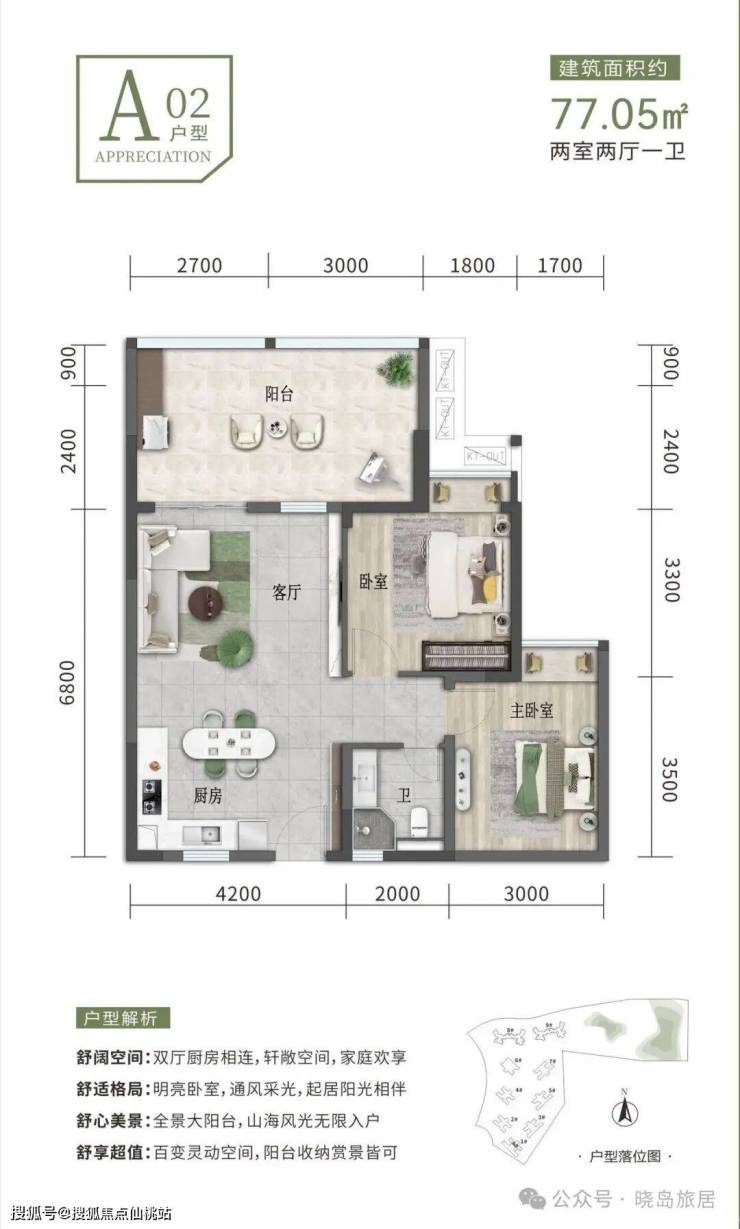 建筑面积约69-104㎡一至三房,方正开阔空间,户户阳台,动静分离,功能分区,厨房、阳台等多功能配套,全能居家,旅居休憩或家庭度假皆可。