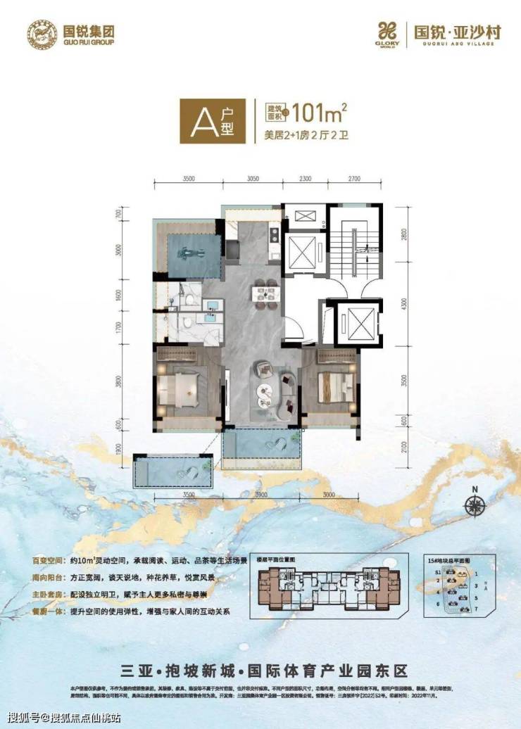 A 户型 101㎡的美居 2 + 1 房两厅两卫,约 10㎡灵动空间,可随心打造阅读角、健身房等;南向阳台开阔,种花养草、赏景聊天皆可;主卧套房独立明卫,私密又尊崇;餐厨一体,增进家人互动。