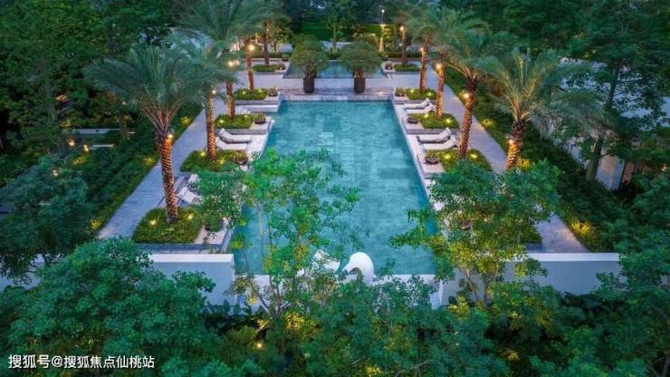 沉林泳池,以孔雀蓝大理石铺底,休息区背景饰以普拉达绿奢石,再融入银海枣树构成的热带风情,营造出曼谷四季酒店般的度假氛围。