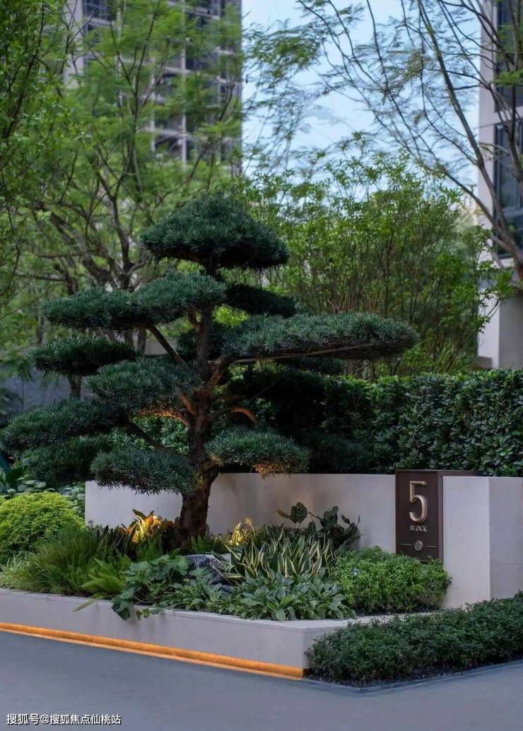 来到单元入口,每栋入户都栽植着2棵树龄20年以上的罗汉松,搭配天然石材铺装,形成尊崇的归家景观。