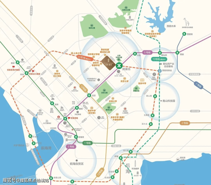 🚇地铁5号线(洪浪北地铁口):向南3站到达宝安中心站(串联1号线)、6站到达前海湾站(串联1/11号线);向北2站到达留仙洞总部基地、7站到达深圳北站;