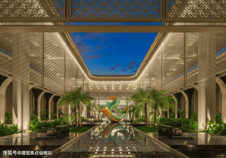 步入近300㎡的半室外庭院,深浅石材与香槟金属线条勾勒出高大空间,阳光透过格栅洒落,与热带植物交织出斑驳光影,心境也随之静谧下来。