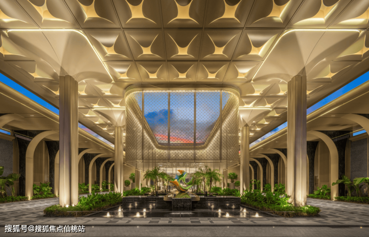 从入口开始,「云栖里」便打破传统社区形式,以酒店式落客区呈现花园感归家礼仪。四棵高耸的狐尾椰屹立门前,视觉上塑造出沉浸式热带归家仪式感,狐尾椰也寓意招财纳福、守护家安。