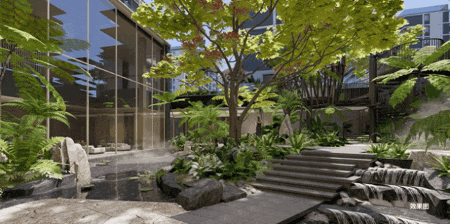 下沉庭院花园更是亮点所在,叠水潺潺、花木扶疏,阳光洒落于叶影斑驳之间;雨林植物与观景亭层层递进,形成立体森境。