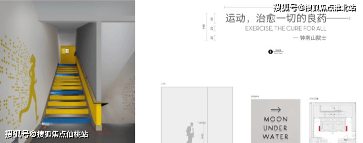 项目AB座以“乐跑楼梯”为理念对楼梯间展开设计,均配置有扶手、灯带、彩色台阶、新风系统等,同时设有鼓励运动的提示标语,以此来鼓励住宅用户更多地使用楼梯来增加锻炼、健身的机会。AB座的楼梯间设置有可开启窗扇,天然采光和自然通风效果良好,并且具有良好的视野。