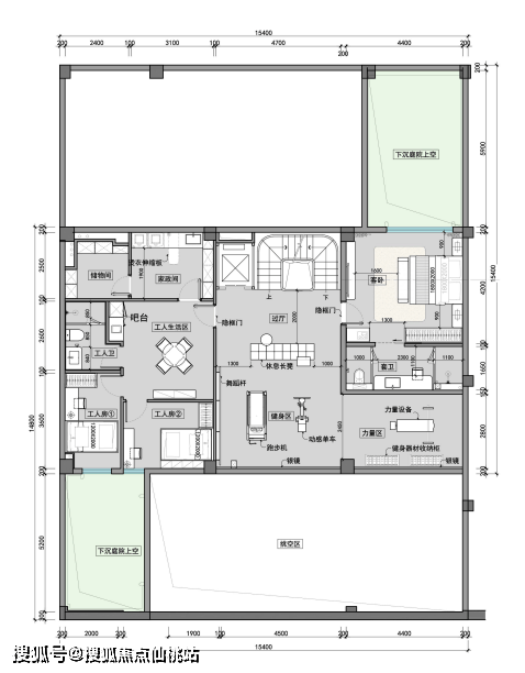 负一层下沉庭院周边环绕健身区、工人生活区与丰富储物空间;