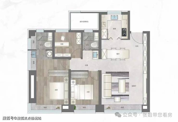 搭配270度观景飘窗的主卧套间,面积约25平米,足以实现“小家化”。