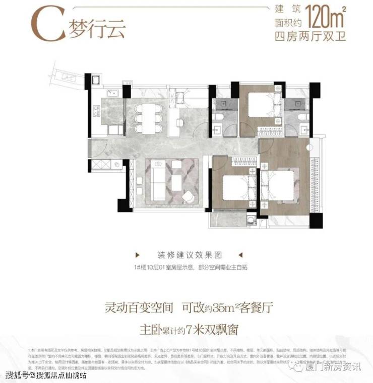 建面约120㎡四房户型,约87%套内综合使用率,空间感比肩市面其它在售产权面积超130㎡,拥有南北全通透大方厅,约14米南向大开间,主卧的超长双飘窗累计约7米长观景台。