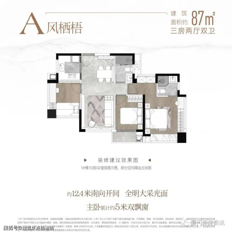 具体到户型设计上同样可圈可点。以建面约87㎡三房户型为例,约89%套内综合使用率,空间感比肩市面其它在售产权面积约98㎡,4开间南向面宽约12.45米。主卧更是拥有总长约6米的三面飘窗,轻松实现南北通透、四面采光,可谓名副其实的“阳光户型”,这在目前市面上的小三房设计中实属难得。