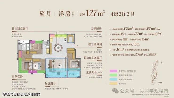 127㎡宽敞舒适型(4 房 2 厅 2 卫):5.1 米宽厅 + 独立餐厅,能放下 8 人圆桌,满足大家庭聚餐、宴请需求;103% 的得房率让空间利用率拉满,适合追求 “阔居感” 的改善客群。