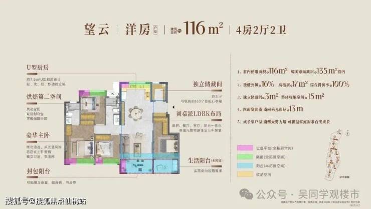 116㎡黄金标准型(4 房 2 厅 2 卫):得房率 100%,推售占比 38.4%,是项目的 “流量担当”。LDKB(厨房 - 餐厅 - 客厅 - 阳台)一体化布局让空间更开阔,西式岛台兼顾社交与实用,双卫设计实现主卧私密与公共需求分离,适配三口之家的品质生活。
