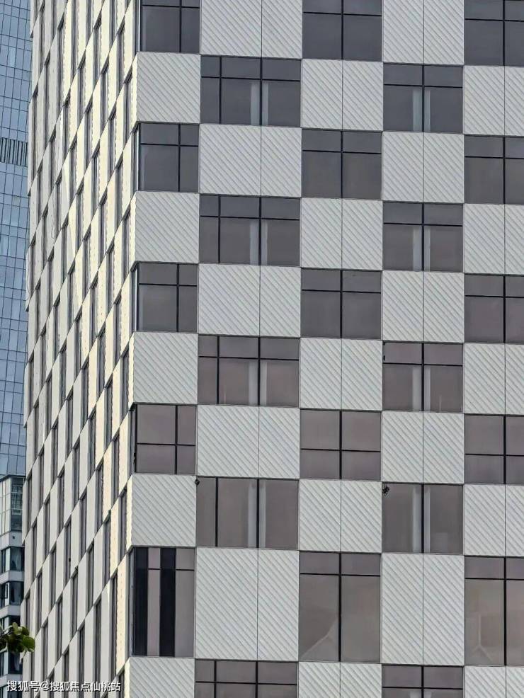 在T3塔楼幕墙施工中,以玻璃和波纹金属板为核心元素,通过精准对位拼接,形成极具韵律感的棋盘格立面风格。