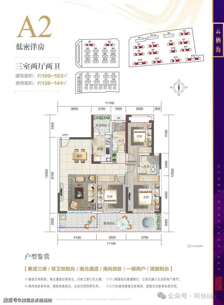 2、A2 100平米三房两卫,使用面积136-141平米