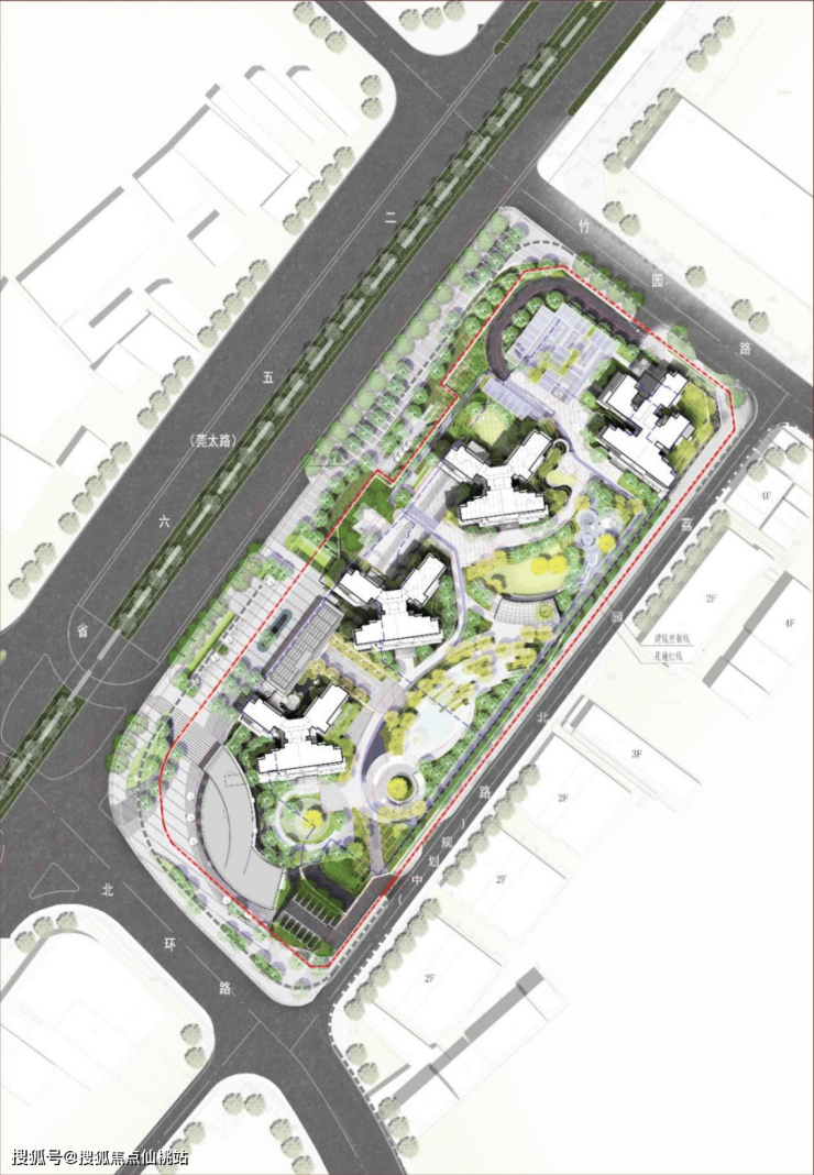 项目总图布局致力于景观资源最大化,4栋塔楼创新楼型,错位布置,实现景观面最大化。同时塔楼将小区内部花园围合,与临路隔开,营造出张弛有度的序列空间,围合出尺度适宜、私密的庭院空间。