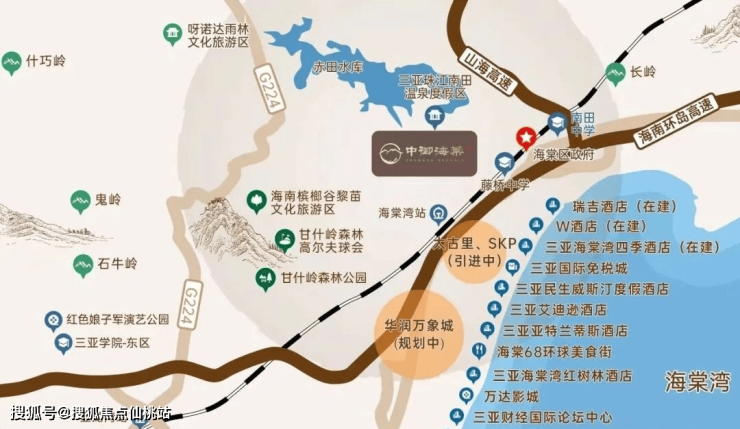 海棠湾是海南唯一一个由国家规划打造的度假湾区,定位为国家海岸,22公里海岸线汇聚千亿配套,32家超五星级酒店、4大主题乐园、5大高尔夫球场、310解放军医院海南分院、亚洲最大单体免税店、华润超级万象城、北京华联SKP等资源环伺。中御海棠项目位于海棠湾南田片区,坐享东线高速、山海高速、机场、高铁、城际公交等三维立体交通网,度假生活出行四通八达。