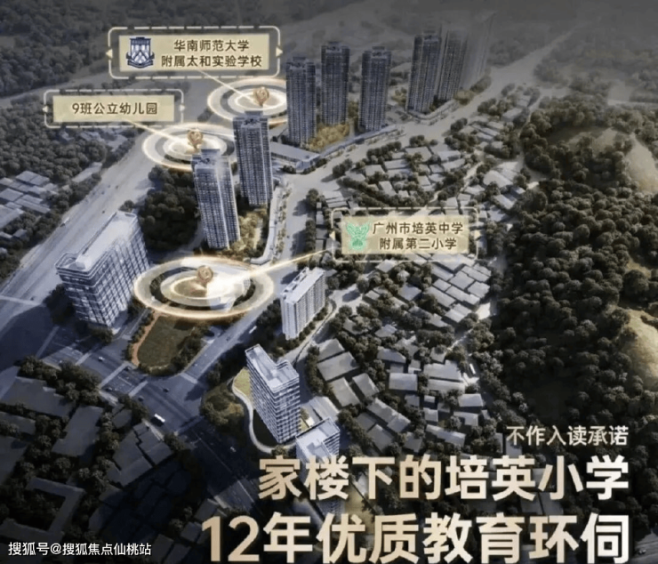 广州培英中学已有 145 年建校史,广州市首批广东省国家级示范性高中,近年来高考本科率超90%(不做入读承诺)。100m内有九年一贯制华赋学校,3km内有大源小学、金星小学等多所优质中小学。