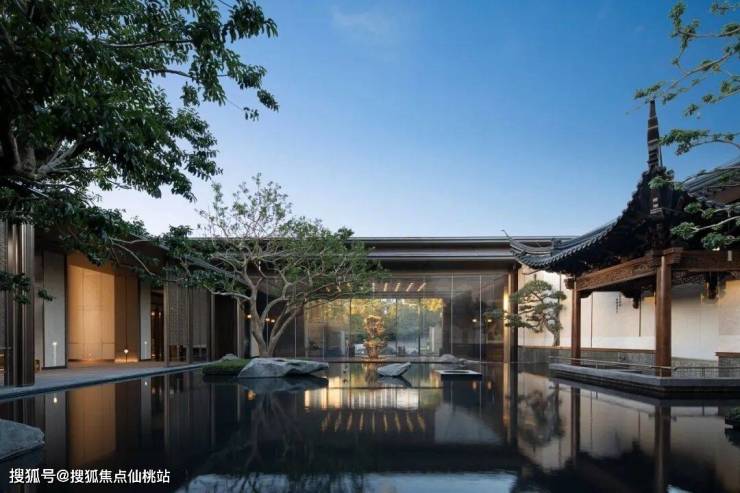 穿过府门,玻璃之后的画像已勾勒出自然风雅的生活遐想。山水隐园中大片的镜水面映入眼帘,烟波浩渺中矗立着的铁冬青一树斜飘、摇曳生风。