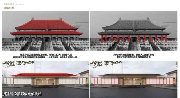 屋檐取意中国古建最高屋顶形制—重檐庑殿顶,并用现代材质化繁为简,刻画出檐深远、端庄大气的姿态。