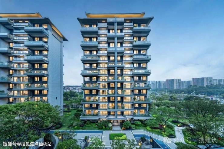 在外立面上,大面积采用通透感十足的 LOW-E光幕玻璃为基调,融入中式飞檐,结合高档浅色外立面,取代常规的墙体设计,又有了现代极简的灵巧,让窗外的自然景色,与玻璃立面相互映衬,相得益彰。