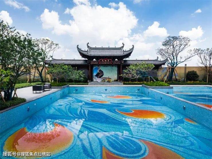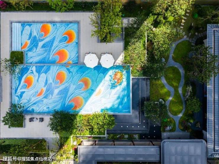 凤栖亭以传统斗拱技艺筑就,取意“凤凰栖居”,在对称格局中沉淀礼序精神;泳池则围绕“凤凰于飞”主题,将文化寓意融入365平方米的分龄设计之中,分设成人池与儿童池,兼顾安全畅游与视觉诗意。碧波映亭,二者一静一动,共同构筑出一处可游可赏、承载美好寓意的生活场景。